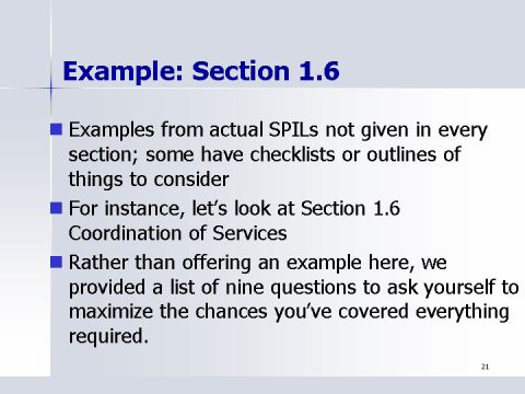 - Examples from actual SPILs not given in every section; some have checklists or outlines of things to consider