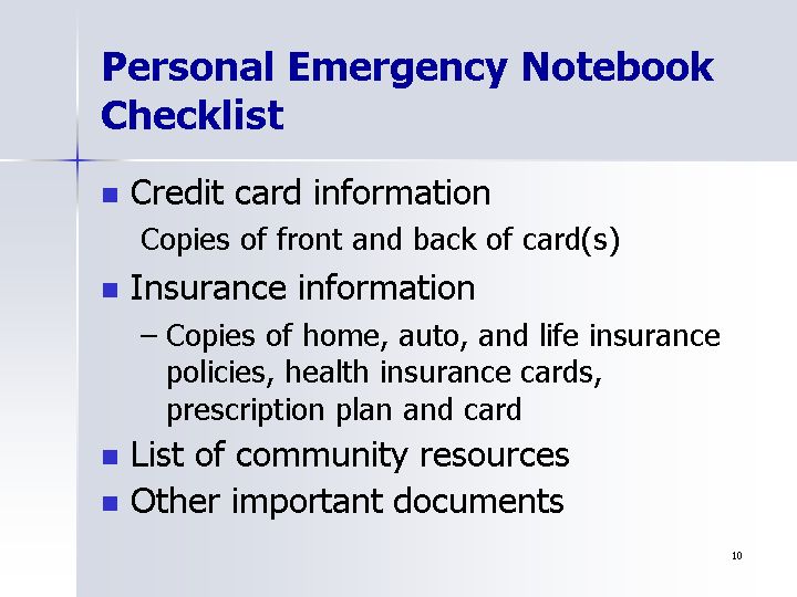 - Copies of home, auto, and life insurance policies, health insurance cards, prescription plan and card