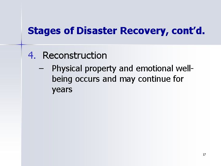 Stages of Disaster Recovery, cont'd.