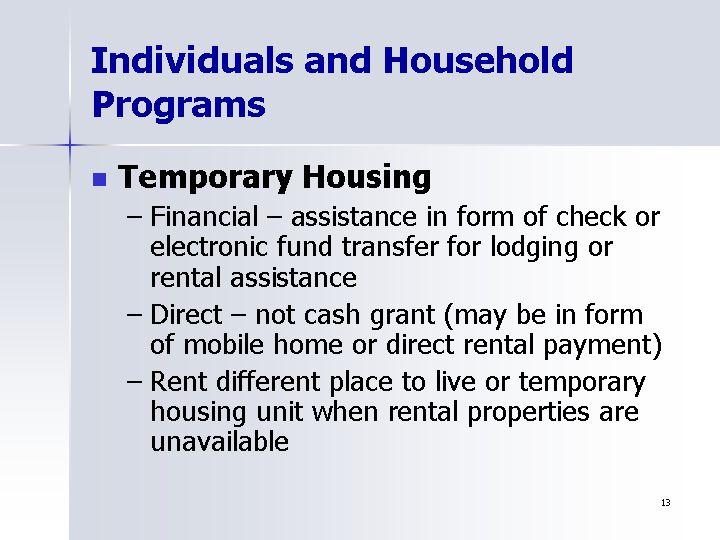 - Direct - not cash grant (may be in form of mobile home or direct rental payment)