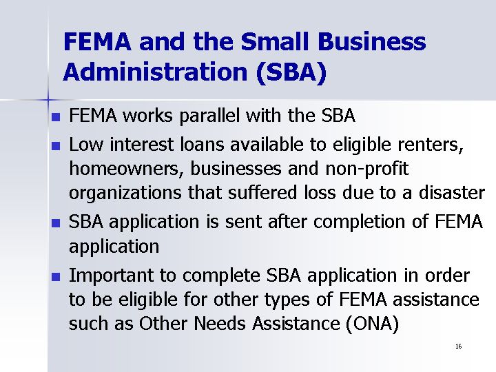 - Important to complete SBA application in order to be eligible for other types of FEMA assistance such as Other Needs Assistance (ONA)
