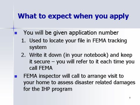 - FEMA inspector will call to arrange visit to your home to assess disaster related damages for the IHP program