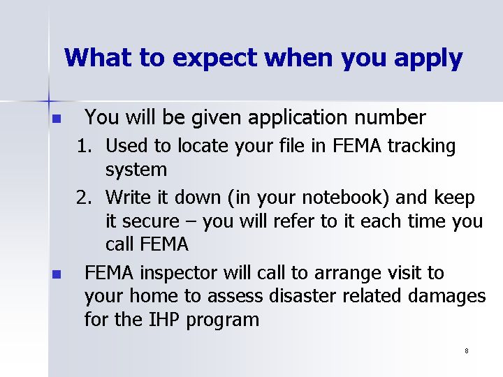 - Write it down (in your notebook) and keep it secure - you will refer to it each time you call FEMA