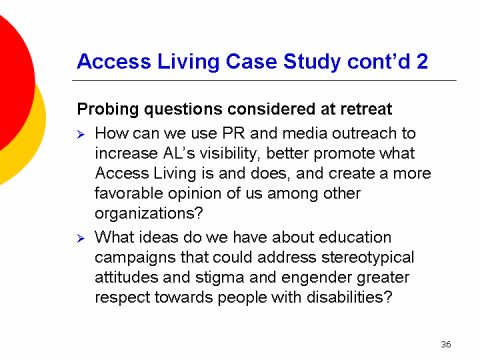 - How can we use PR and media outreach to increase AL's visibility, better promote what Access Living is and does, and create a more favorable opinion of us among other organizations?