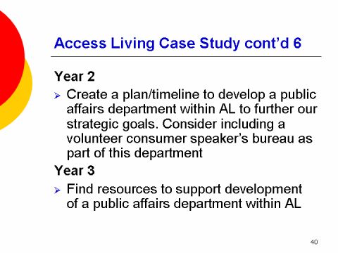 - Create a plan/timeline to develop a public affairs department within AL to further our strategic goals. Consider including a volunteer consumer speaker's bureau as part of this department