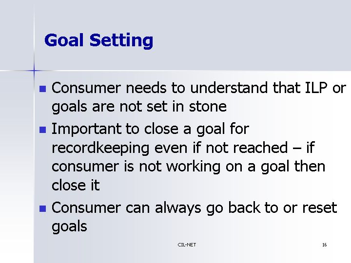 - Important to close a goal for recordkeeping even if not reached - if consumer is not working on a goal then close it