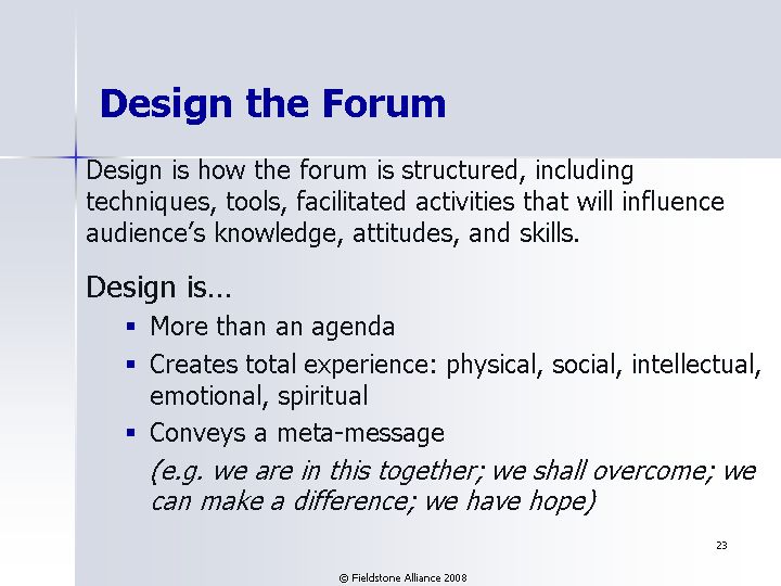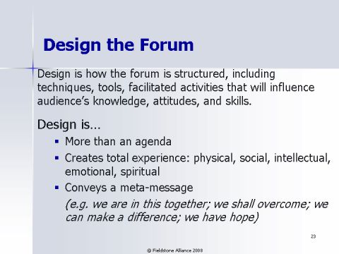- Design is how the forum is structured, including techniques, tools, facilitated activities that will influence audience's knowledge, attitudes, and skills.
