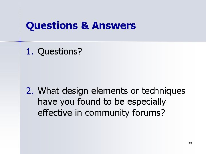 - What design elements or techniques have you found to be especially effective in community forums?