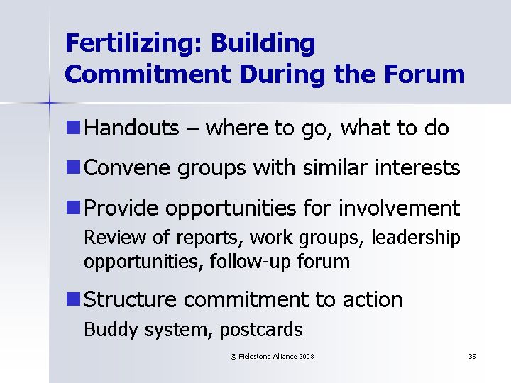 - Review of reports, work groups, leadership opportunities, follow-up forum