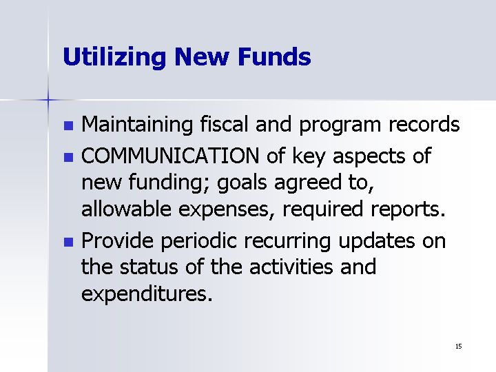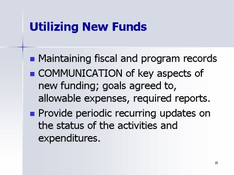 - COMMUNICATION of key aspects of new funding; goals agreed to, allowable expenses, required reports.
