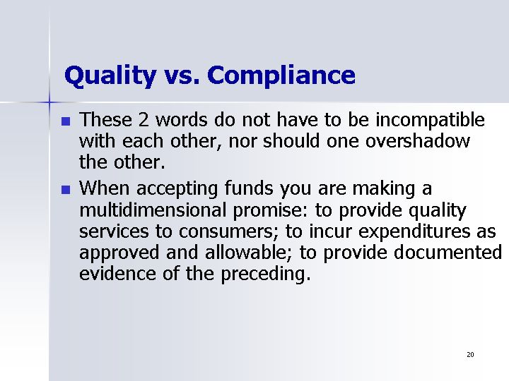 - When accepting funds you are making a multidimensional promise: to provide quality services to consumers; to incur expenditures as approved and allowable; to provide documented evidence of the preceding.