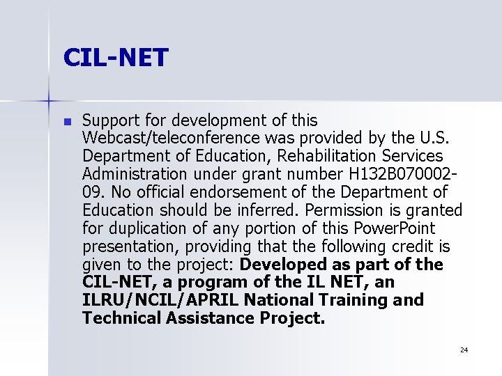 - Support for development of this Webcast/teleconference was provided by the U.S. Department of Education, Rehabilitation Services Administration under grant number H132B070002-09. No official endorsement of the Department of Education should be inferred. Permission is granted for duplication of any portion of this PowerPoint presentation, providing that the following credit is given to the project: Developed as part of the CIL-NET, a program of the IL NET, an ILRU/NCIL/APRIL National Training and Technical Assistance Project.
