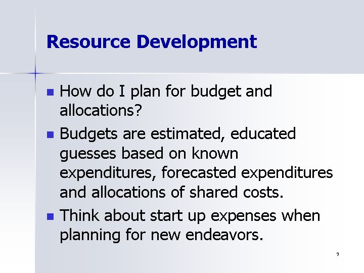 - Budgets are estimated, educated guesses based on known expenditures, forecasted expenditures and allocations of shared costs.