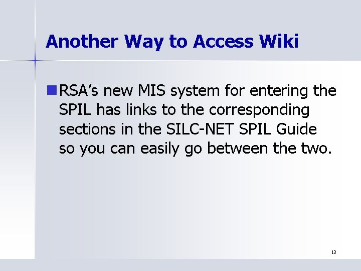 RSA's new MIS system for entering the SPIL has links to the corresponding sections in the SILC-NET SPIL Guide so you can easily go between the two.