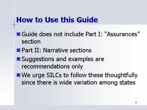 - We urge SILCs to follow these thoughtfully since there is wide variation among states