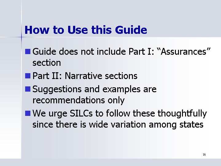 - Guide does not include Part I: "Assurances" section