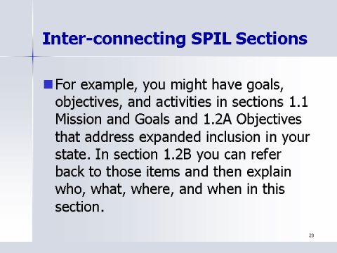 - For example, you might have goals, objectives, and activities in sections 1.1 Mission and Goals and 1.2A Objectives that address expanded inclusion in your state. In section 1.2B you can refer back to those items and then explain who, what, where, and when in this section.