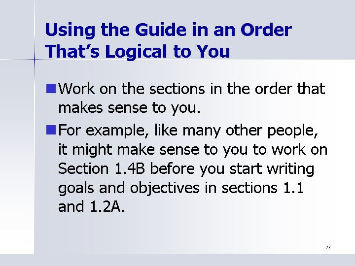 - For example, like many other people, it might make sense to you to work on Section 1.4B before you start writing goals and objectives in sections 1.1 and 1.2A.
