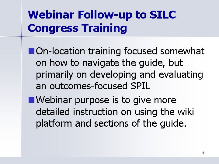 - Webinar purpose is to give more detailed instruction on using the wiki platform and sections of the guide.