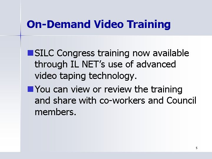 - SILC Congress training now available through IL NET's use of advanced video taping technology.