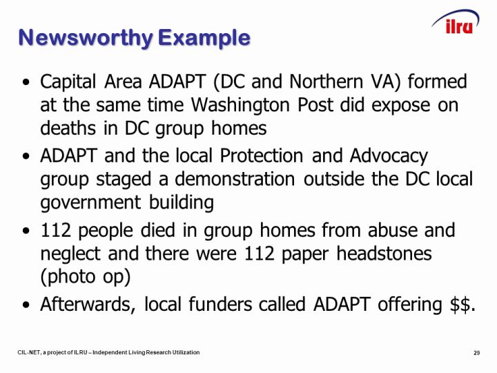 - Capital Area ADAPT (DC and Northern VA) formed at the same time Washington Post did expose on deaths in DC group homes
