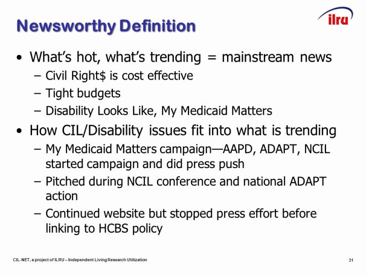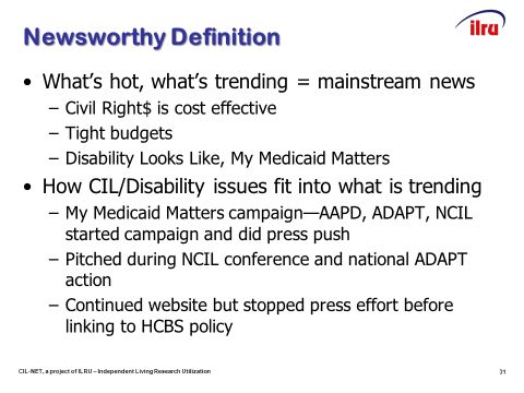 - My Medicaid Matters campaign—AAPD, ADAPT, NCIL started campaign and did press push